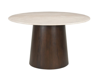 De kenmerkende bottecino tafelbladen, met hun verfijnde adering, rusten op een elegant mangohouten onderstel dat warmte toevoegt aan elk meubelstuk.