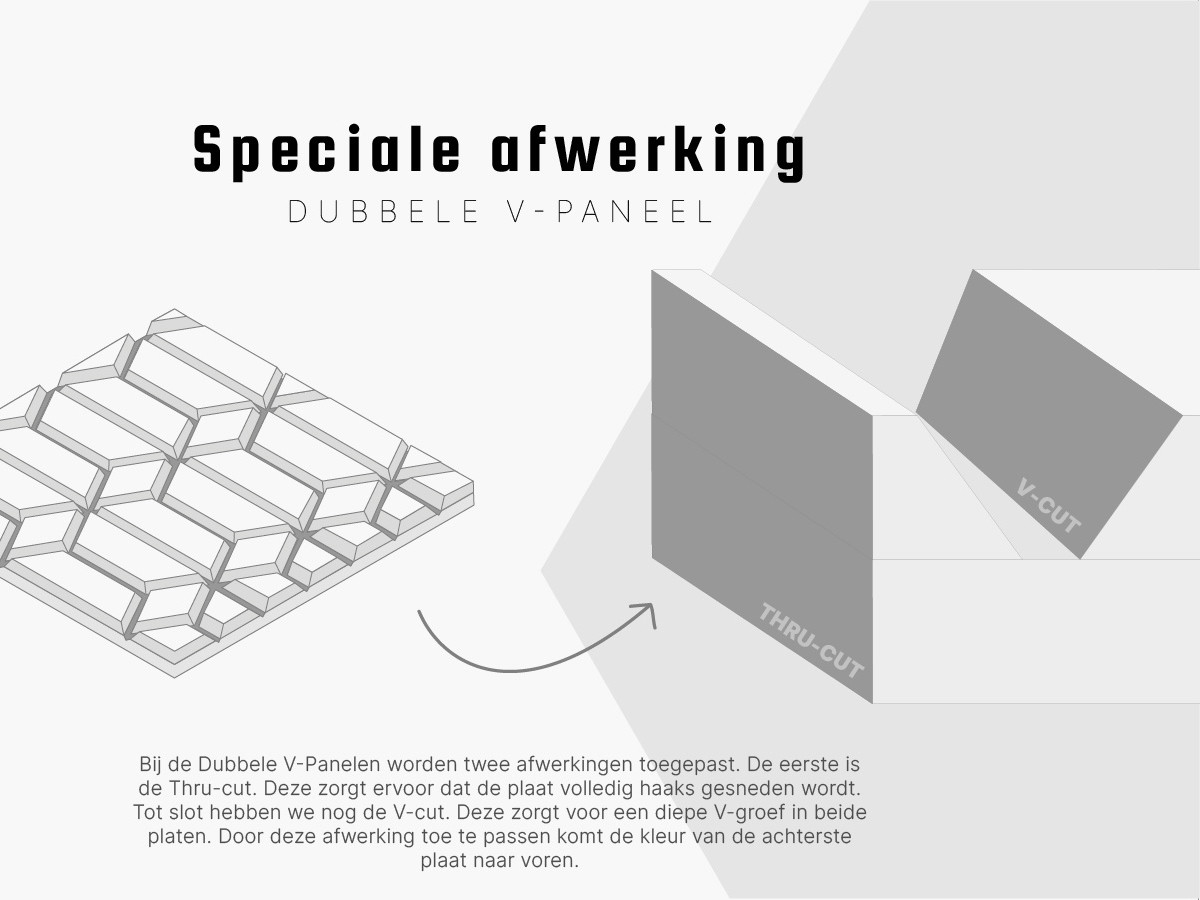 Geef je ruimte een modern randje met ons Dubbele V-Paneel. Met diepe V-groeven die subtiel gevuld kunnen worden met kleur, biedt dit paneel een unieke schoonheid. Kies uit meer dan 40 kleuren en ontdek diverse grafische patronen. Het resultaat? Een dynamisch 3D-effect dat niet alleen de visuele aantrekkingskracht verhoogt, maar ook een inspirerende omgeving creëert voor iedere ruimte.