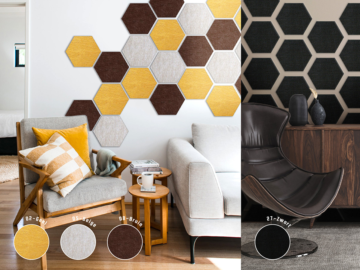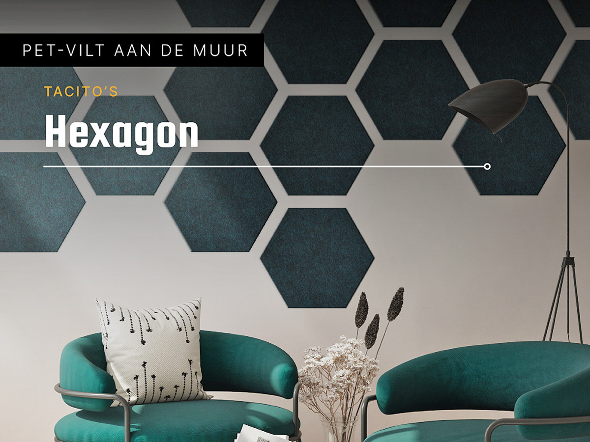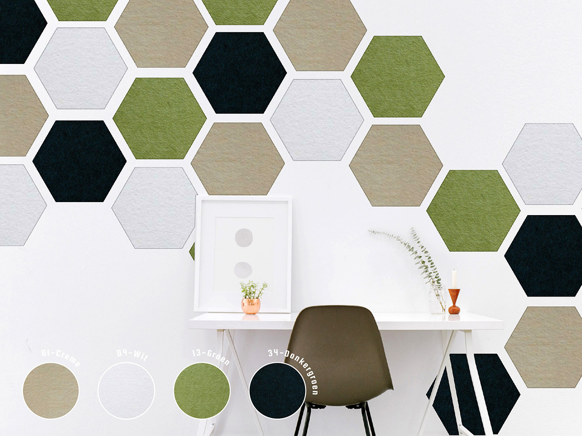 De Hexagon is een echte sfeermaker en geeft ieder oppervlak een dynamisch beeld. De combinatie van de speelse vorm en de geluidsdempende werking van PET-vilt maakt model Hexagon de ideale wanddecoratie voor iedere ruimte.
