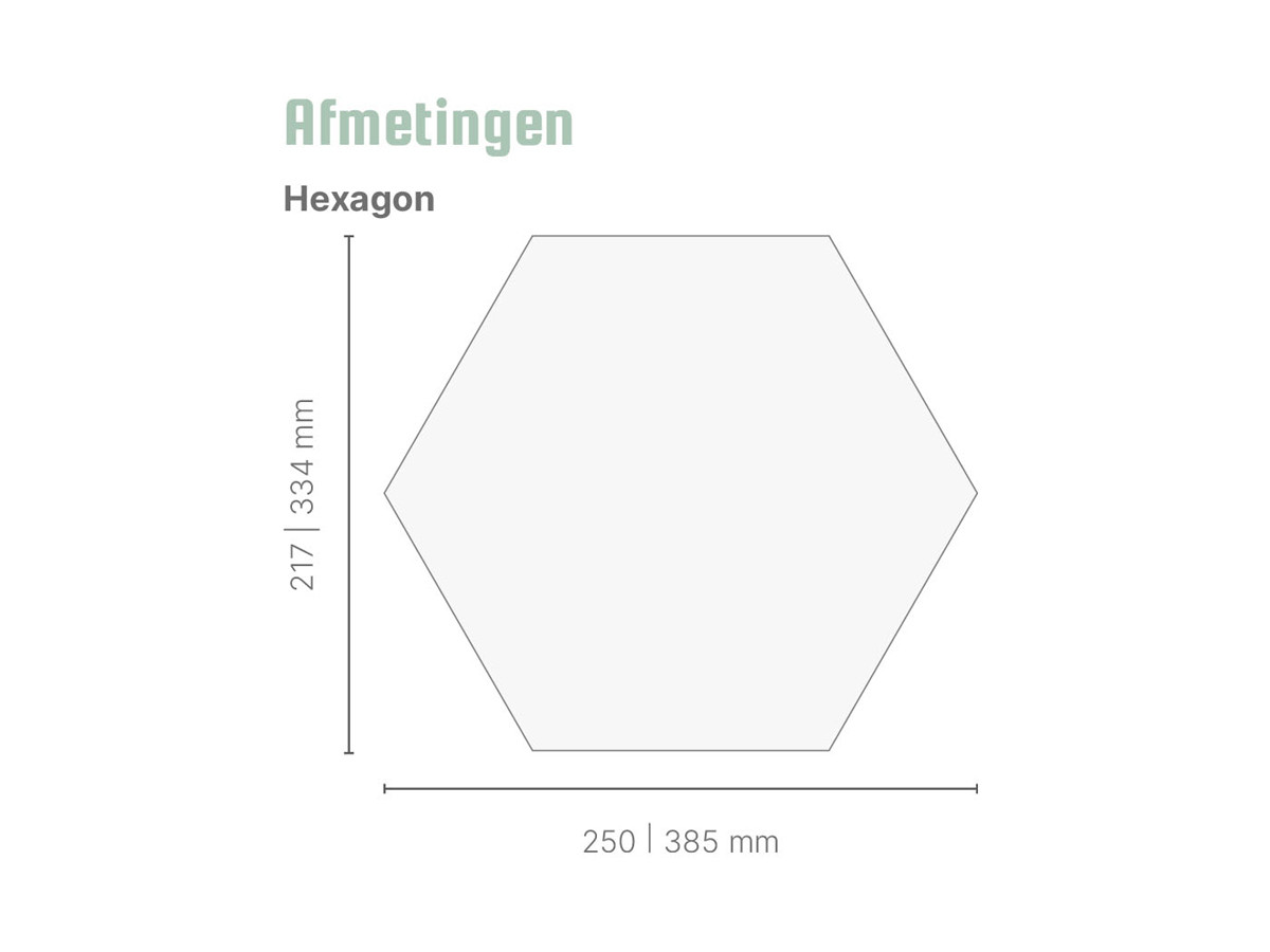 Een strakke en speelse wand creëer je met onze Hexagons. Varieer in kleur en bestel meerdere sets of ga voor één kleur voor een rustig geheel. Je kunt kiezen uit twee maten Hexagons: 250 bij 217 mm en 385 bij 334 mm. We werken de Hexagons af met een speciale ‘Bevel-cut’, voor een ultrastrakke afwerking.