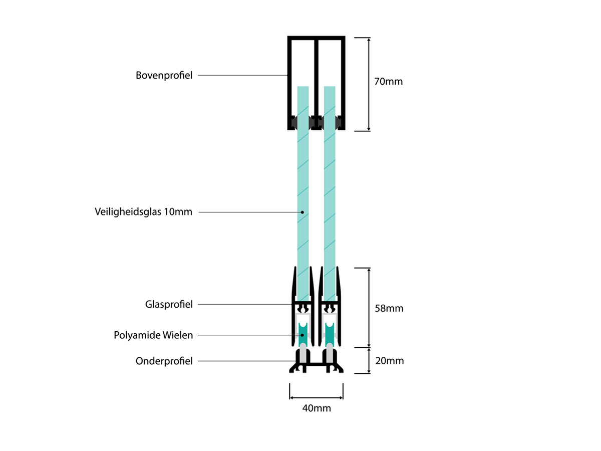 - Compleet pakket: Glaspanelen; H-profiel voorgemonteerd met wielenset; Railset; Tochtborstels; Zijaansluit U-profielen