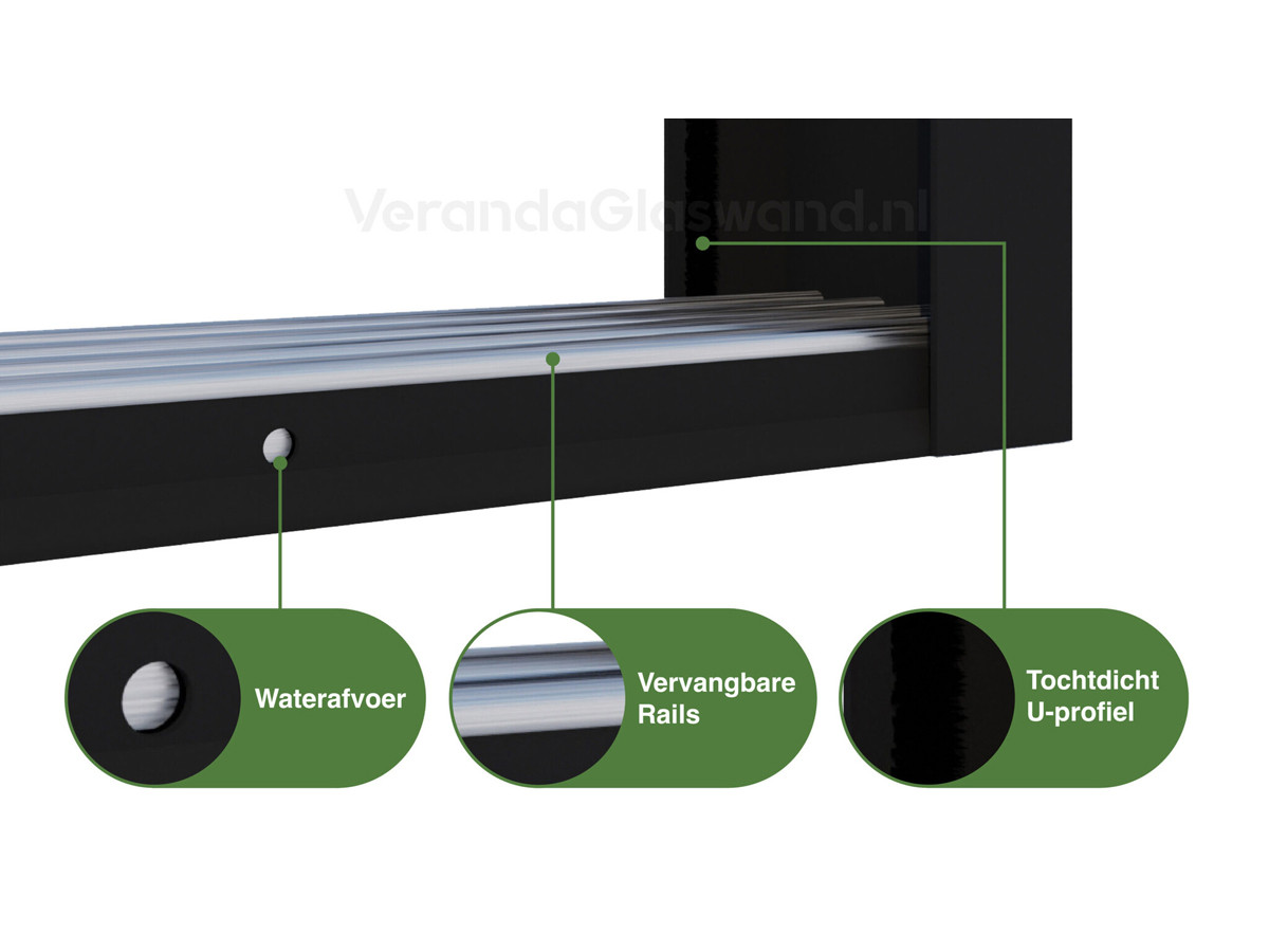 - Compleet pakket: Glaspanelen; H-profiel voorgemonteerd met wielenset; Railset; Tochtborstels; Zijaansluit U-profielen
